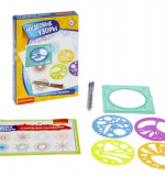 В комплекте: спирограф, 4 фигурных вкладыша, альбом для рисования и разноцветная ручка.