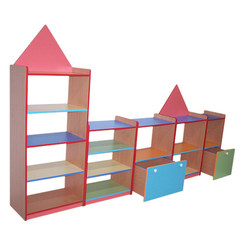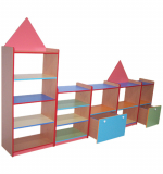 Описание: Основной цвет бук или кремовый. Фасады цветные, по желанию заказчика. Стенка разделена на 5 стеллажей, основа стеллажей - цвет бук или кремовый, полки и фасады ящиков - цветные. Один стеллаж высокий, над верхней полкой задняя стенка из ЛДСП в виде треугольника, всего 5 полок, задней стенки нет. Остальные стеллажи одной высоты: два - с выдвижными ящиками на колесиках и двумя полками, задних стенок нет. Третий стеллаж с 4-мя полками, без задней стенки, 5-тый стеллаж с тремя полками, над верхней задняя стенка из ЛДСП в виде треугольника.