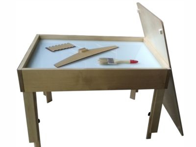 Рабочая поверхность стола 70х50 см выполнена из безопасного стекла с подсветкой (18 различных цветов). Включение/выключение стола, а также переключение подсветки осуществляется при помощи пульта ДУ.