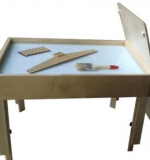 Стол имеет регулируемую высоту от 48 до 61 см. Деревянная крышка столешницы размером 75х50х1 см позволяет работать на ровной поверхности как на обычном столе.