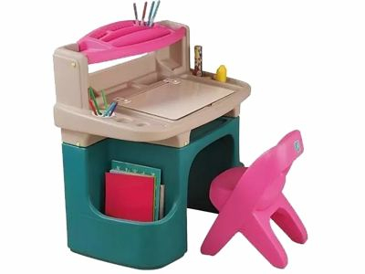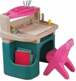 Откидная поверхность для рисования и письма легко очищается и открывается для доступа к вместительному нижнему отделению для хранения. Большая рабочая поверхность имеет встроенные углубленные отделения для красок, клея и других предметов. В комплект входит прочный стульчик с удобной спинкой.