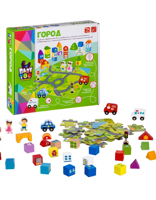 ГРАТ ВВ2382 Город - Строительные кубики / 57дет, конструктор, коврик-пазл, дерево, 3+