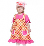 Карнавальный костюм детский для девочки из серии костюмы для животных персонажа Поросенка. Костюм включает в себя платье в виде клетчатого сарафана с розовой блузкой и шапочку-маску. Платье украшено декоративными пуговицами спереди, двумя накладными карманами, белой тесьмой и розовой оборкой по низу юбки.