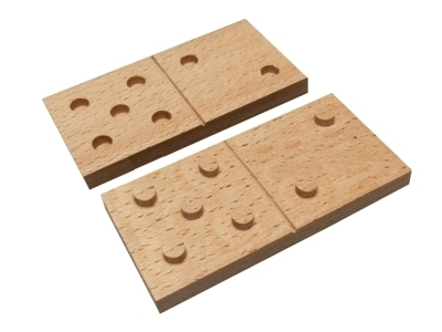 Пара состоит из фишек, разделенных поперек на 2 части с изображением в виде "точек" двух типов - в виде выступающего элемента сферической формы и в виде углубления сферической формы.