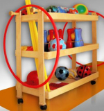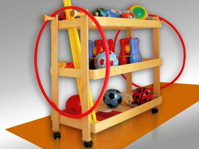 Тележка предназначена для хранения спортивного инвентаря. Для удобства передвижения предусмотрены колеса. Стеллаж имеет три короба для размещения различного спортивного оборудования. Короба изготовлены из фанеры толщиной 15 и 6 мм, опоры из фанеры толщиной 18 мм. Покрытие лак.