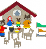 Изба, ель, стул 3шт., стол, кровать 3шт., горшочек, миска 3шт., девочка, медведь, медведица, медвежонок.