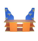 Описание: Основной цвет бук или кремовый. Фасады цветные по желанию заказчика. Нижняя часть уголка представляет собой двух тумбовый стол с дверками, разделенными двумя открытыми полками. Внутри тумб по две полки. По бокам, с краев - сегменты с двумя полками. Над столешницей с двух крайних сторон - симметричные декоративные элементы фигурной формы из ЛДСП, на которых по три полочки на консолях.