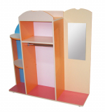 Описание: Основной цвет бук или кремовый. Фасады цветные по желанию заказчика. Уголок разделен на три отделения, первое - две полки секторного вида, второе отделение с полкой вверху, под которой штанга для нарядов, третье отделение с зеркалом. Задние стенки в отделениях с полками и с зеркалом из ЛДСП, с вешалом - ДВП.