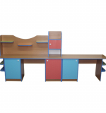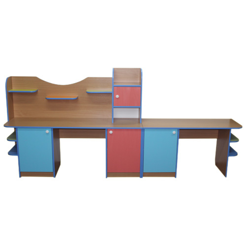 Описание: Основной цвет бук или кремовый. Фасады цветные по желанию заказчика. Представляет собой два рабочих места с одной столешницей. Первое рабочее место - стол с двумя тумбами с дверками, внутри каждой по две полки, к крайней тумбе прикреплены две открытые закругленные полки. Над столешницей располагается декоративная панель фигурной формы с тремя полками, справа - узкий пенал-надстройка с одним закрытым шкафчиком, снизу и сверху которого по открытой полке. Второе место - стол, со стороны присоединения к первому столу - тумба с дверкой, внутри которой две полки, с противоположной стороны сегмент с двумя открытыми полками, как и у первого стола.
