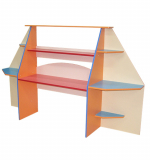 Описание: Основной цвет бук или кремовый. Фасады цветные по желанию заказчика. Уголок представляет собой стол с двумя высокими сегментами по бокам. Над столом сегменты соединены между собой двумя открытыми полками, столешница со стороны стены имеет бортик из ЛДСП фигурной формы. Сегменты симметричны, на уровне столешницы большая полка, ниже и выше две полочки меньшего размера.