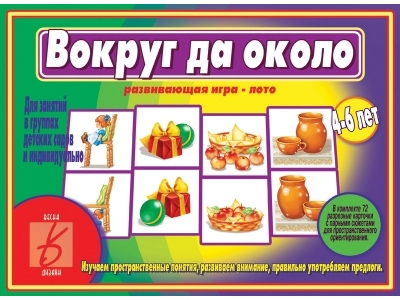 Развивающая игра-лото, при помощи которой дети смогут освоить пространственные понятия (лево-право и т.п.), научиться правильно употреблять предлоги, разовьют зрительное восприятие и произвольное внимание. Перед началом игры требуется разрезать карты по пунктирным линиям.