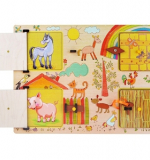 Замочки «Ферма» – это доска-бизиборд с четырьмя дверцами, закрытыми оригинальным способом: вертушком, крючком, задвижкой и ключом. За каждой дверью ребенок может найти милую хрюшку, курочку, корову или лошадку. Кроме зверей, которые спрятались, на игрушке изображены другие животные и даже насекомые.