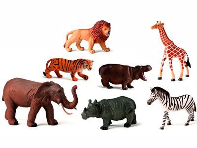 В прозрачной пластиковой банке находятся семь фигурок африканских животных: слон, носорог, бегемот, жираф, лев, зебра.